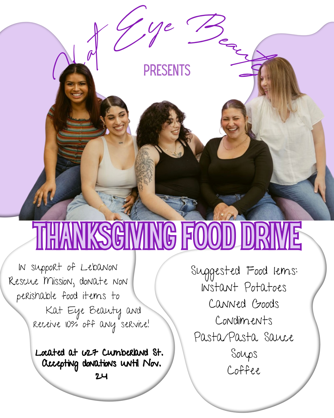 Bring non perishable food items to our salon for 10% off your service!